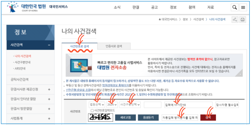 - 사건 번호(연도+사건분류번호+나머지 사건번호)를 입력합니다.