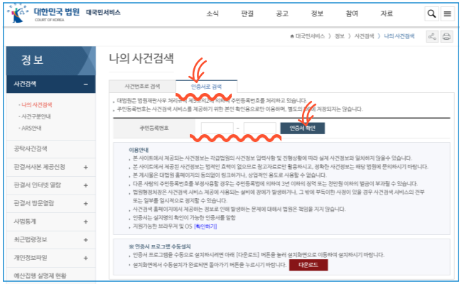 - 인증서를 통해 본인 확인 절차를 거친 후, 해당 사건이 있는 결과를 보여줍니다.
