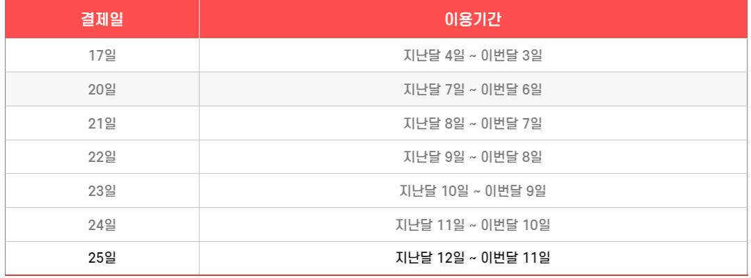 이처럼 결제일이 매우 다양하여 본인의 상황에 맞게 선택하여 결정하시는게 좋겠습니다.