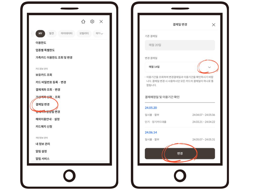 - 당월이나 다음 달에는 결제일을 변경할 수 없으므로 시간적 여유가 필요합니다.
