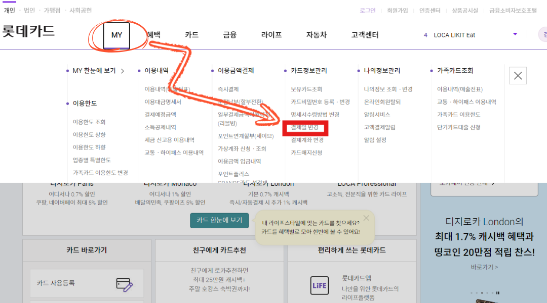 2. MY메뉴에 마우스를 올리면 아래 메뉴바가 열립니다. 카드정보관리의 '결제일 변경'을 클릭하여 결제일을 변경합니다.