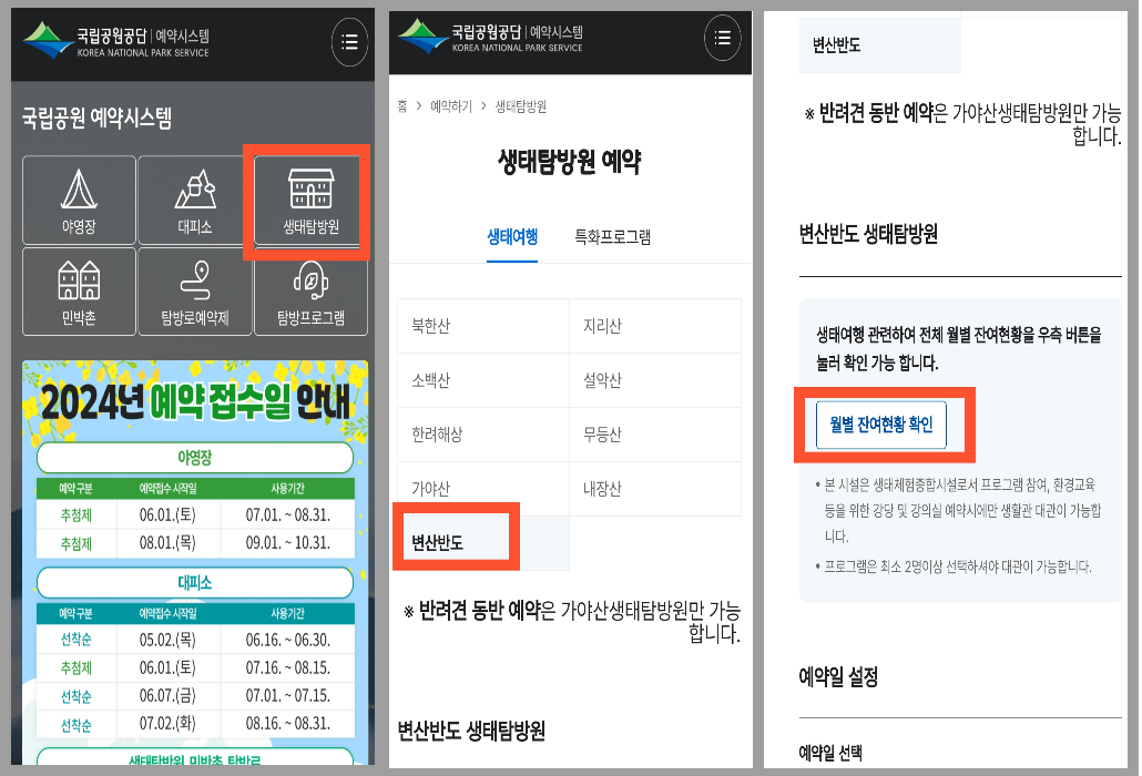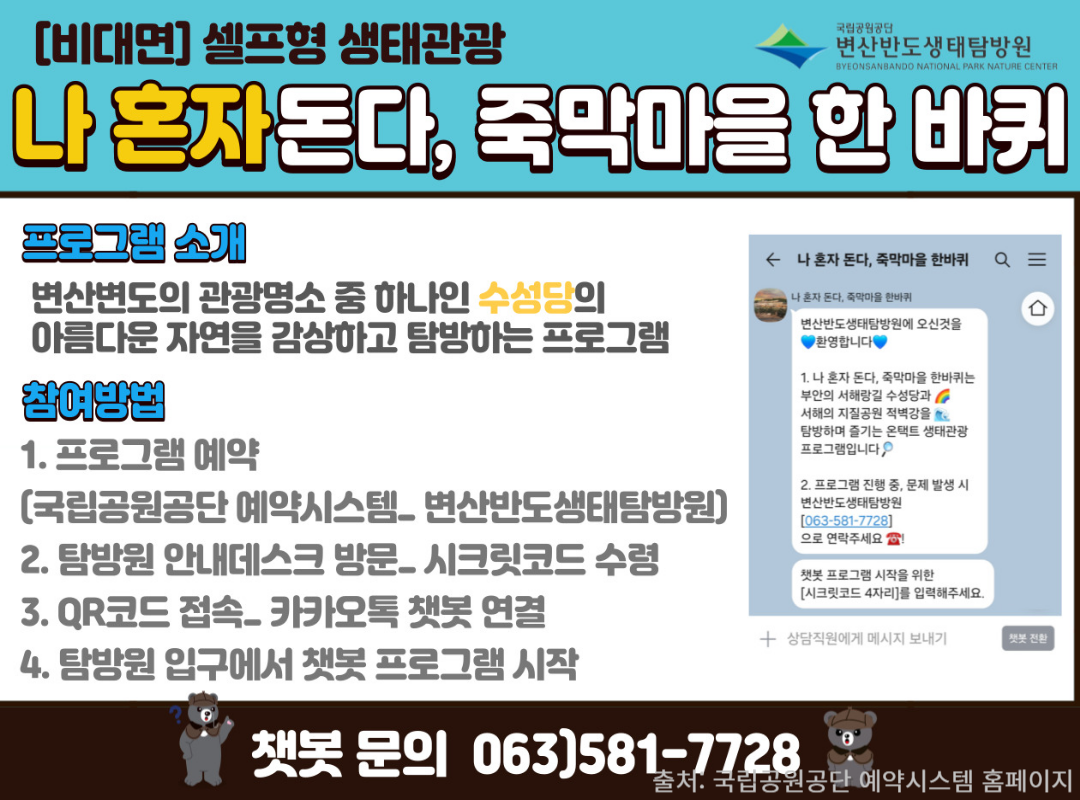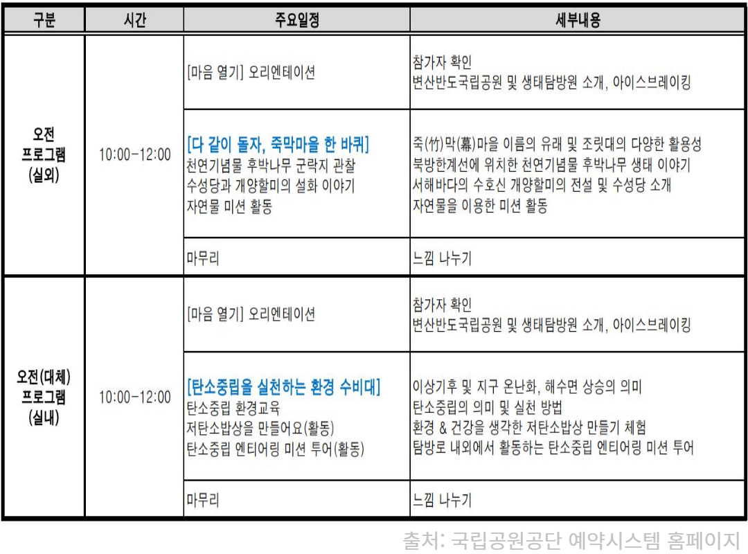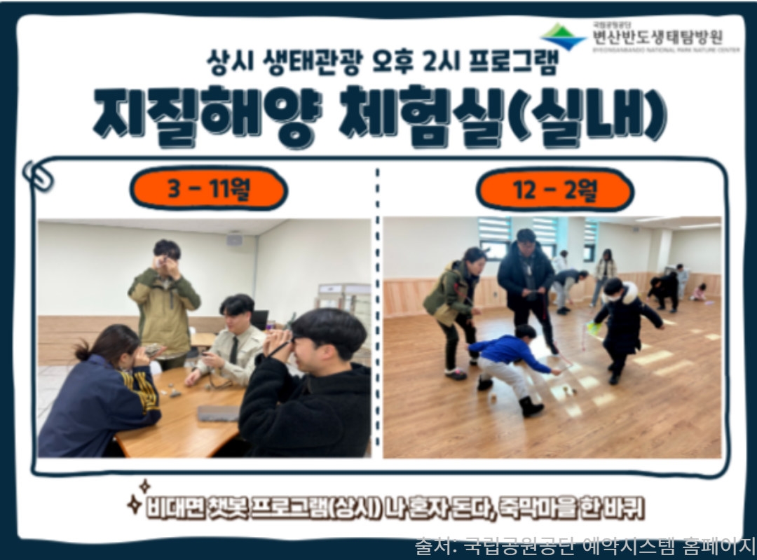 변산반도 생태탐방원은선착순 예약제로 운영 되니 아래 링크를 통해 원하는 날짜로빠르게 예약하시길 바랄게요!
