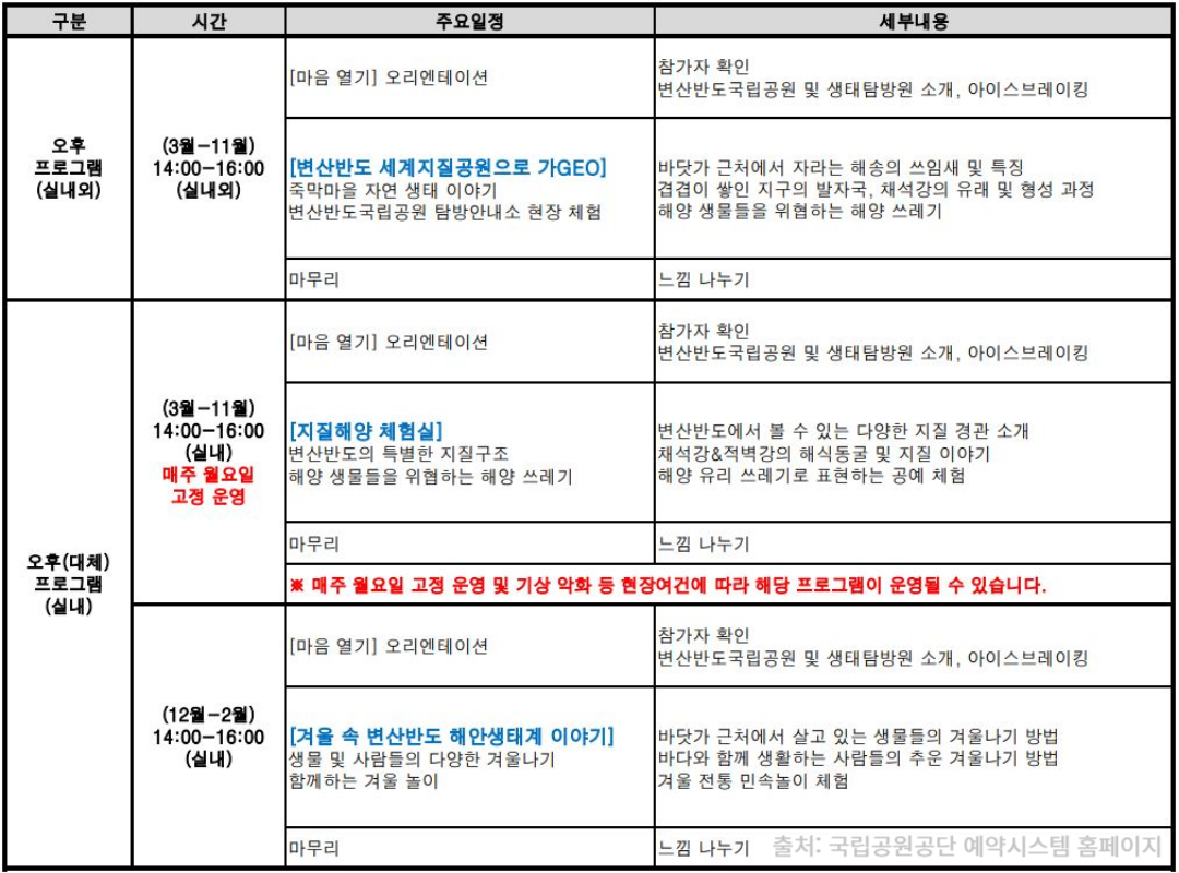 - 일정 내용은 교육동 체험실에서 먼저 오리엔테이션을 하고, 변산반도의 지질구조 암석 관찰, 해양생물 관찰 탐구 활동을 합니다. 그리고 해양쓰레기로 표현하는 내 손 안의 자연 만들기 체험을 하고 마무리합니다. 일정표는 아래 표를 참고해 주세요.