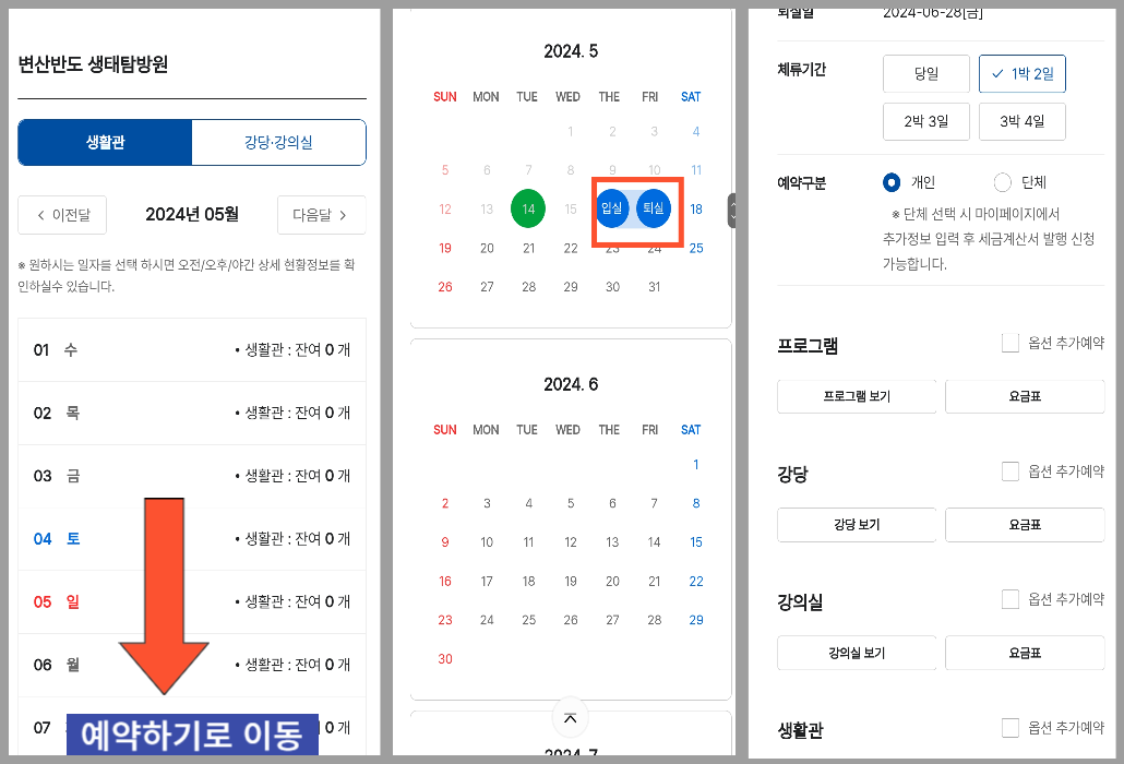 6. 원하는 날짜를 선택했으면 아래로 내려가며 원하는 조건을 선택합니다. ( 단, 프로그램 참여, 환경 교육등을 위한 강단 및 강의실 예약을 하지 않고 생활관(객실)만 단독 예약은 불가합니다.)