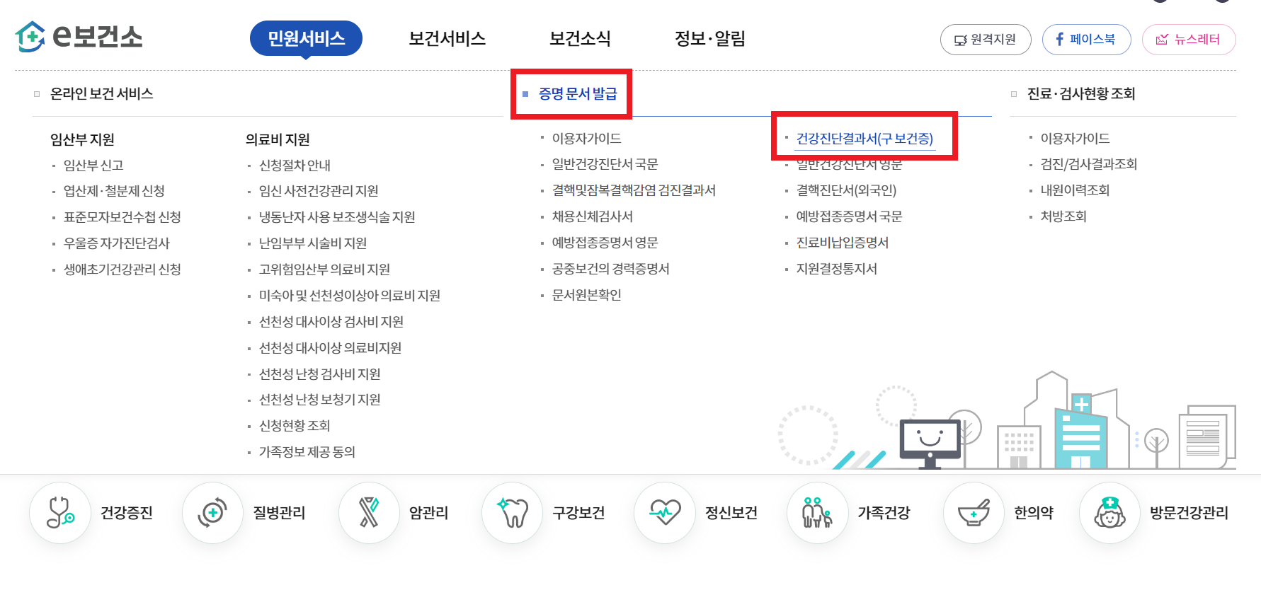 2. '증명 문서 발급' 메뉴 그리고 '건강진단결과서(구 보건증)를 클릭합니다.