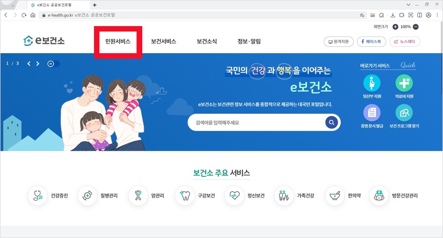 1. 보건소 홈페이지로 접속하여 민원서비스를 클릭 합니다.