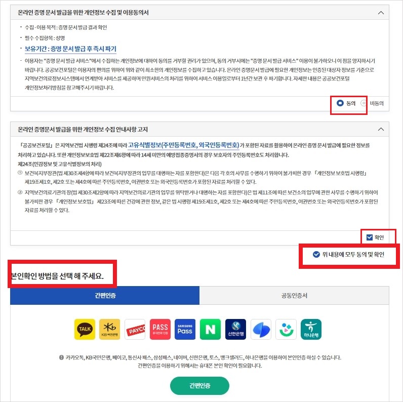 3. 모두 확인을 한 다음 "위 내용에 모두 동의 및 확인"을 체크합니다. 아래의 본인 인증 절차를 진행합니다. 공인인증서가 있으면 "공동 인증서"를 선택하고 간편 인증이 가능하다면 편한 것으로 선택합니다. 요즘은 카카오톡, 네이버, 패스, 패이코, 토스등등 다양한 간편인증 서비스가 있으니 빠르게 진행할 수 있습니다.