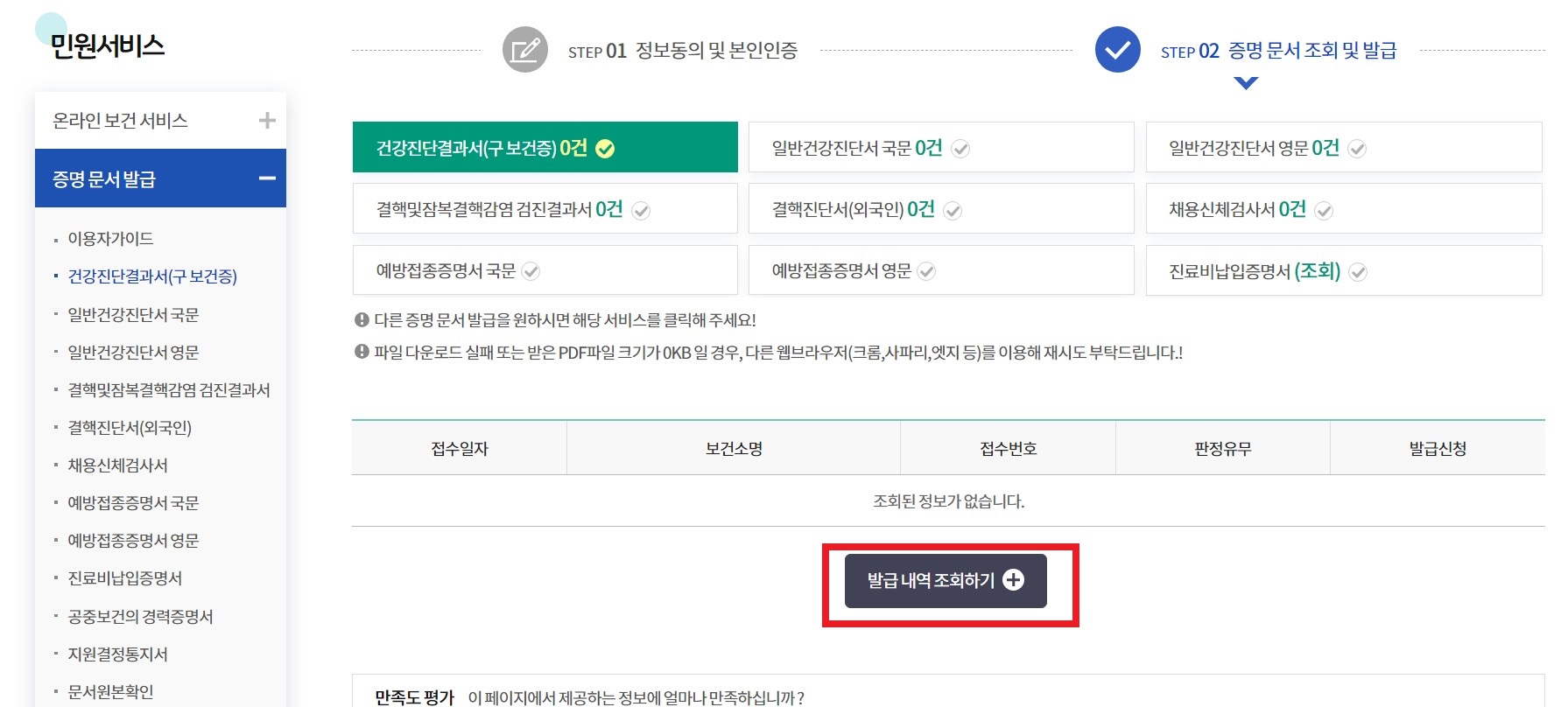 - 간혹 증명서 종류를 혼동한 경우가 있습니다. '건강진단결과서(구 보건증)로 선택했는지 다시 체크해 봅니다.