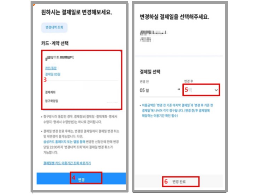 - 결제일 변경은 결제대금 연체 중이거나, 최근 수정 후에 결제금액의 확정이 이루어지지 않았을 때에는 변경이 어렵습니다.