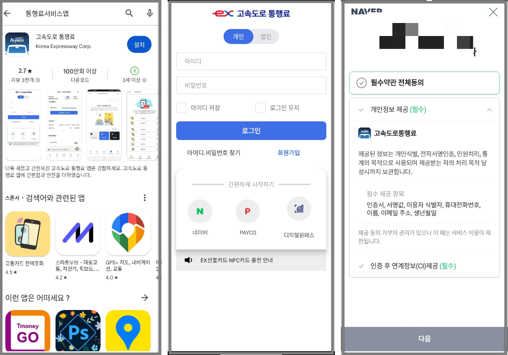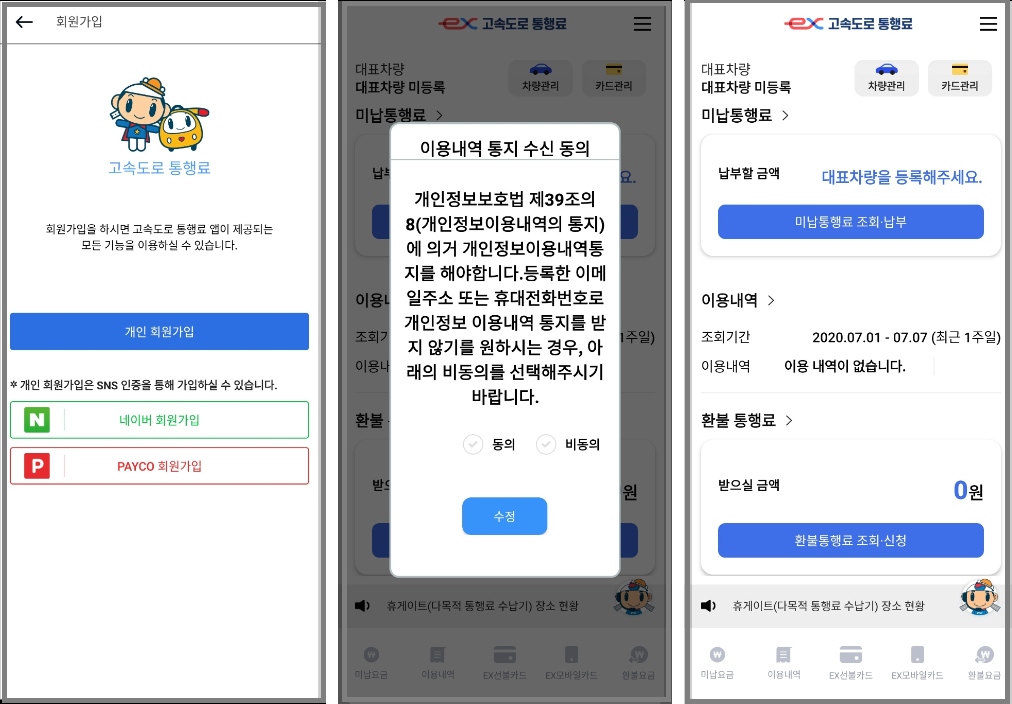 위 버튼을 클릭하여 '고속도로 통행료' 어플을 다운로드합니다. 회원가입을 합니다.(간편하게 시작하기-네이버 등을 통해 인증하면 쉽고 빠르게 진행이 됩니다.) 로그인이 되면 수신 동의를 하고 미납통행료 납부 및 조회를 하여 진행하면 됩니다.