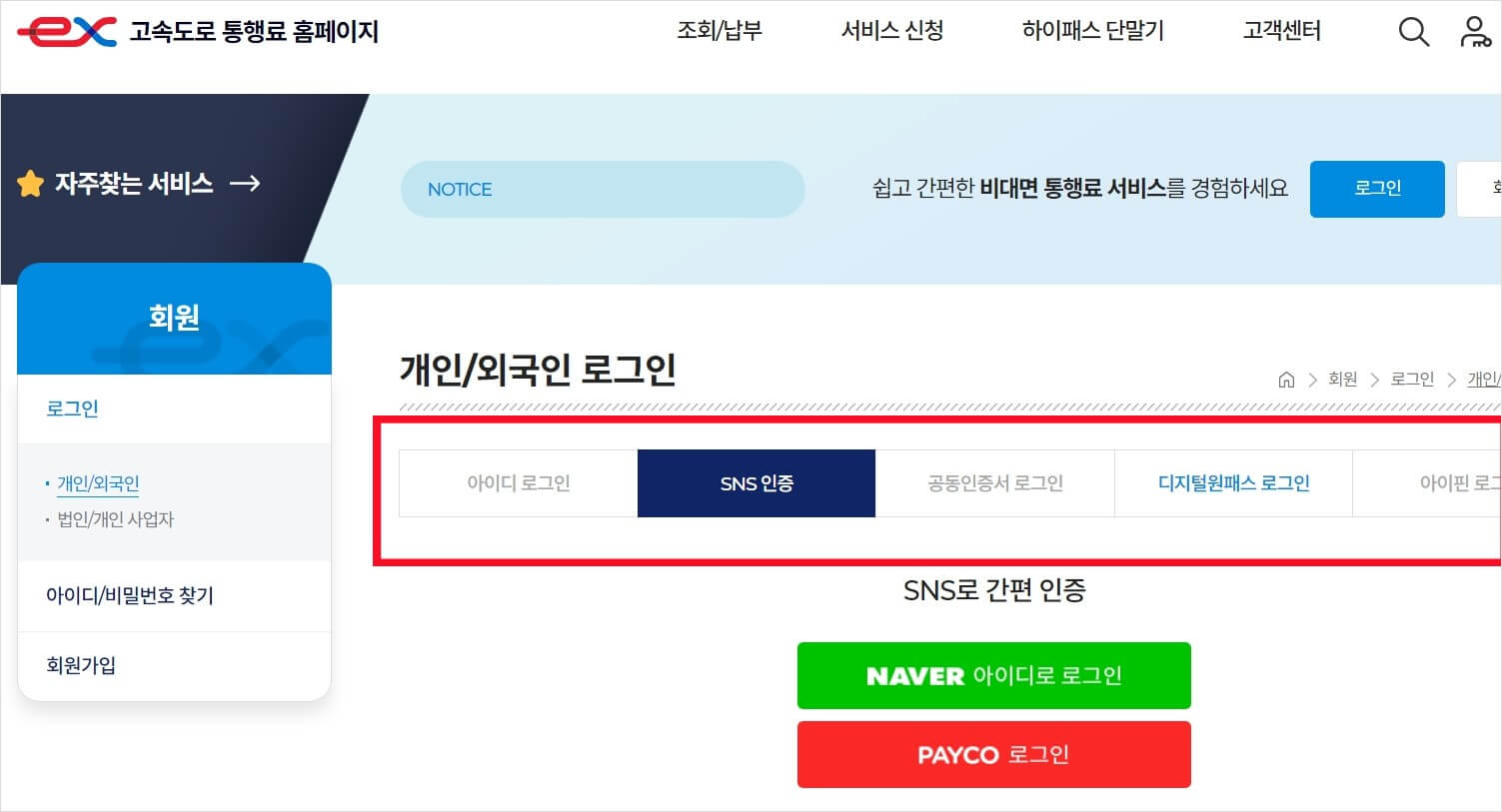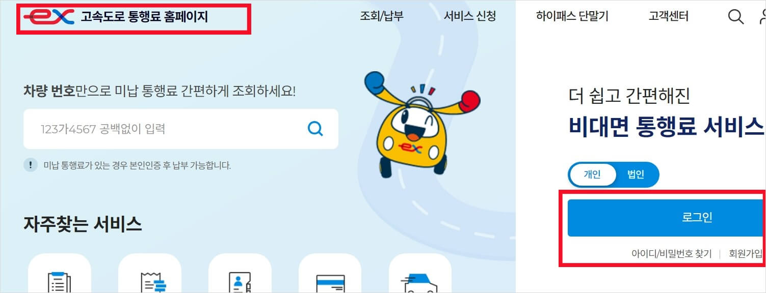 1. 고속도로 통행료 홈페이지(아래 버튼 클릭 또는 사진 클릭)에 접속하여 로그인합니다.