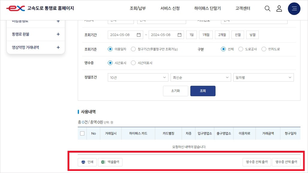 - 하이패스 거래내역 조회 및 출력은 로그인 상태에서 가능합니다.