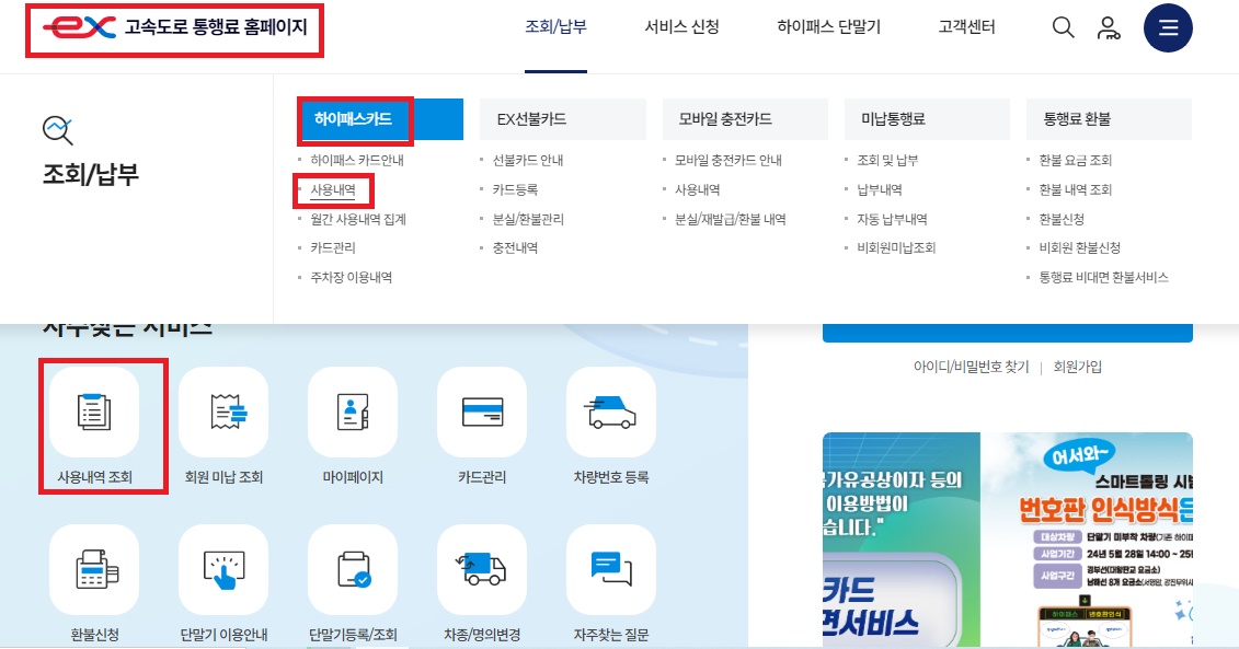 - 메인 홈페이지 접속후 왼쪽 아래 자주 찾는 서비스 > 사용내역조회 (홈페이지 접속 > 조회/납부 > 하이패스카드 > 사용내역)을 선택하여 들어갑니다.