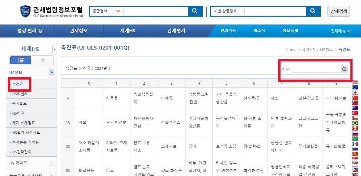 2. 왼쪽 메뉴바 HS정보-속견표를 선택하면 원하는 큰 카테고리의 1차 분류표가 나옵니다. 오른쪽 상단 검색 간에 검색하고자 하는 품명을 입력하여 검색할 수 도 있습니다.