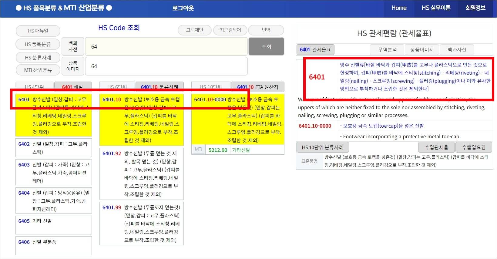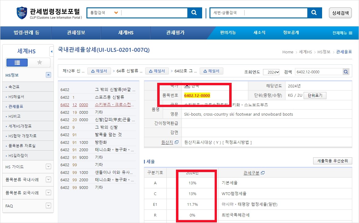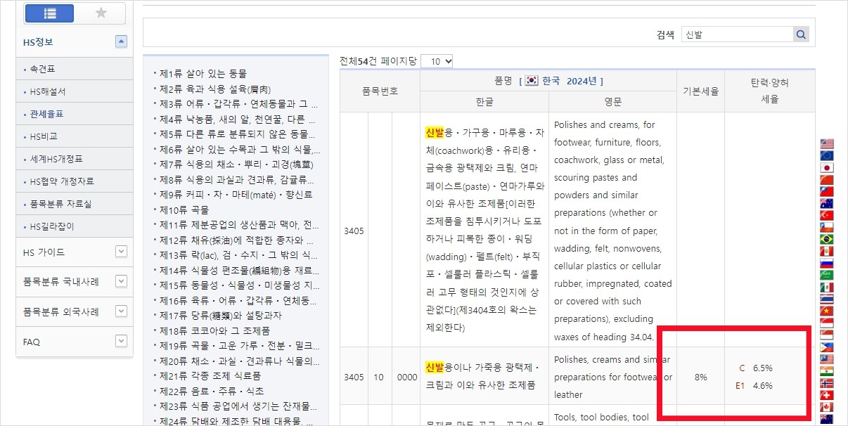 3. '신발'이라는 품목으로 조회를 하면 신발이라는 문구가 들어간 품명은 모두 조회가 됩니다. 해당되는 카테고리 내용들을 확인해 가며, 내가 원하는 품목으로 좁혀가며 찾습니다. (이 부분이 조금 어려워서 제가 이용해본 경험상 위 버튼 중 2번째 버튼 'HS 내비게이션'이 좀 더 편리하더라고요.)