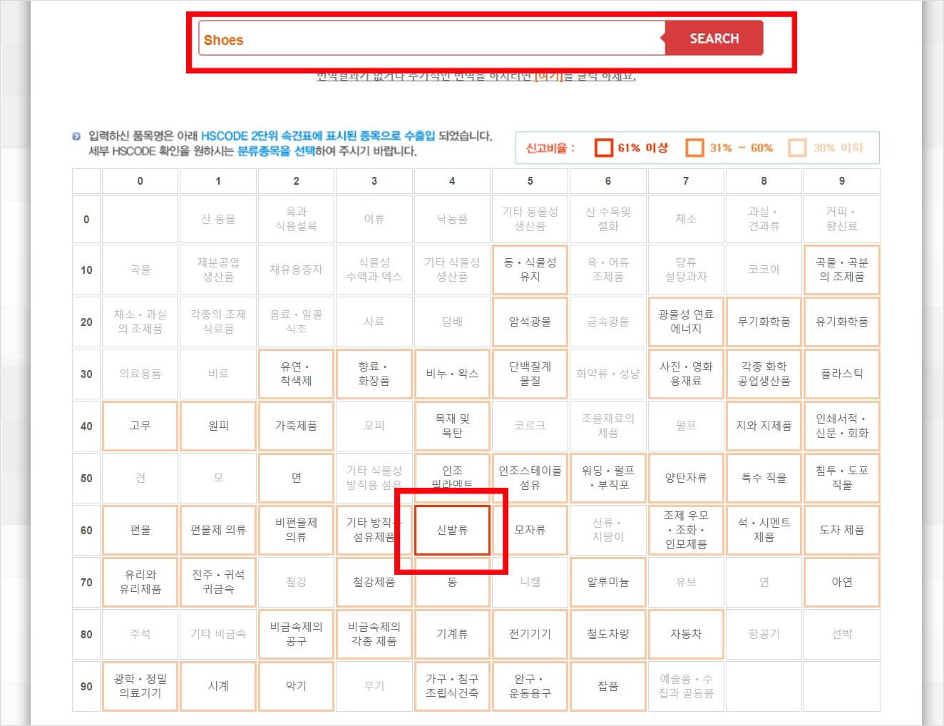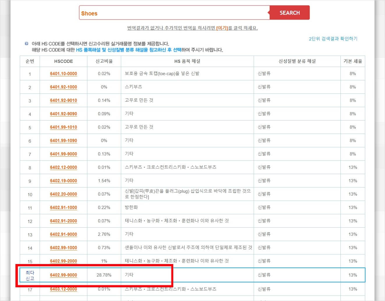 3. 검색란에 '신발' 이라고 적으면 자동으로 'Shoes'로 바뀌고 SEARCH를 눌러 검색을 하면 속건표 중 원하는 품명의 큰 카테고리가 빨간 박스로 표시됩니다.