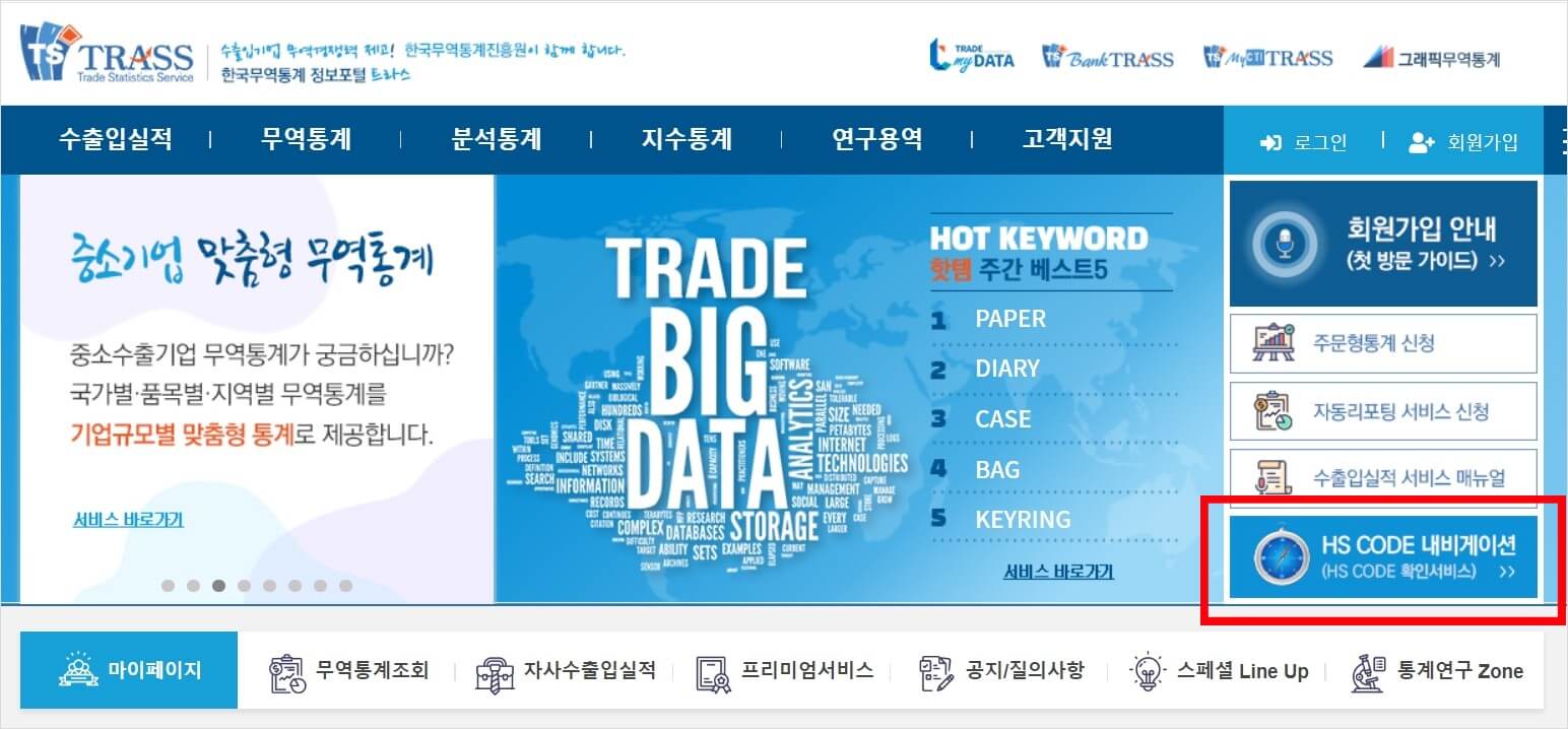 1. 한국무역통계 정보포털 위 2번째 버튼으로 접속하여 오른쪽 하단 HS CODE 내비게이션을 선택하여 들어갑니다.